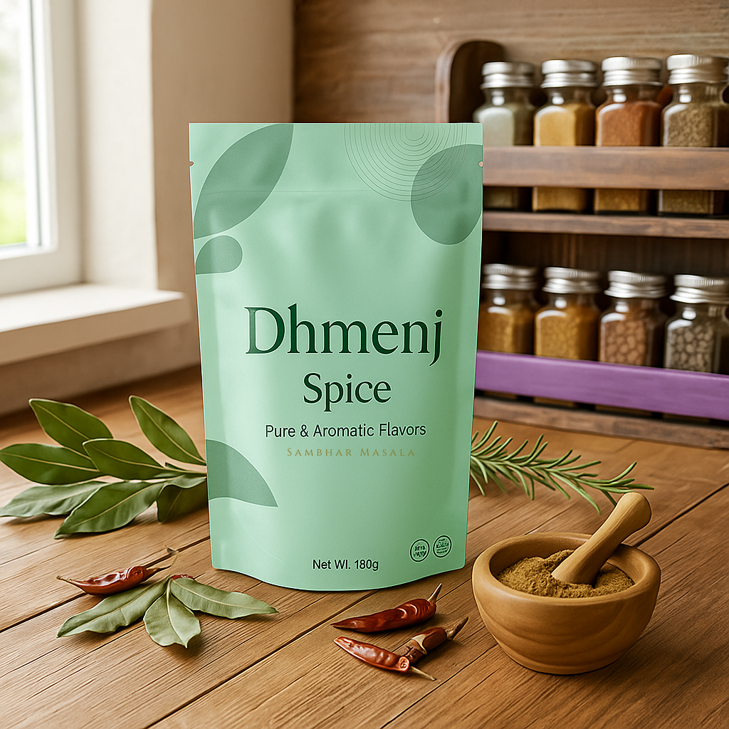 Dhmenj Sambhar Masala uses real South Indian-style spices such as tamarind powder, coriander, methi, and roasted lentils. The blend is balanced to give your sambhar both tanginess and a rich, comforting aroma. Our low-temperature grinding keeps the natural oils of the spices intact—ensuring unmatched freshness. With Dhmenj, your sambhar tastes authentic, aromatic, and homestyle.